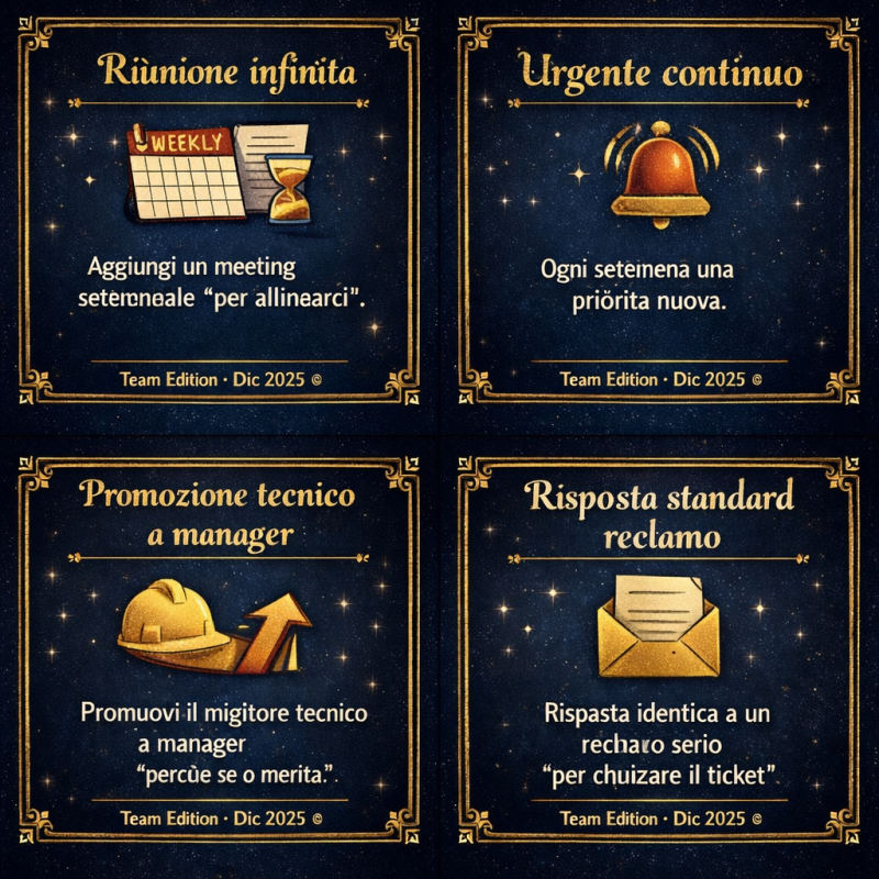Aggiungete un vincolo: budget dimezzato / cliente già irritato / team ridotto / deadline ieri.